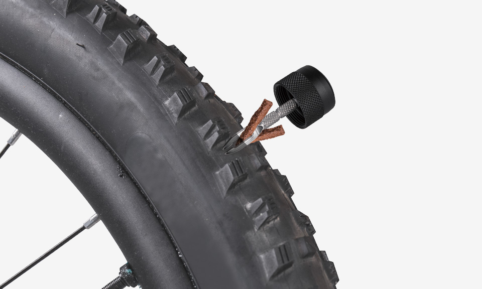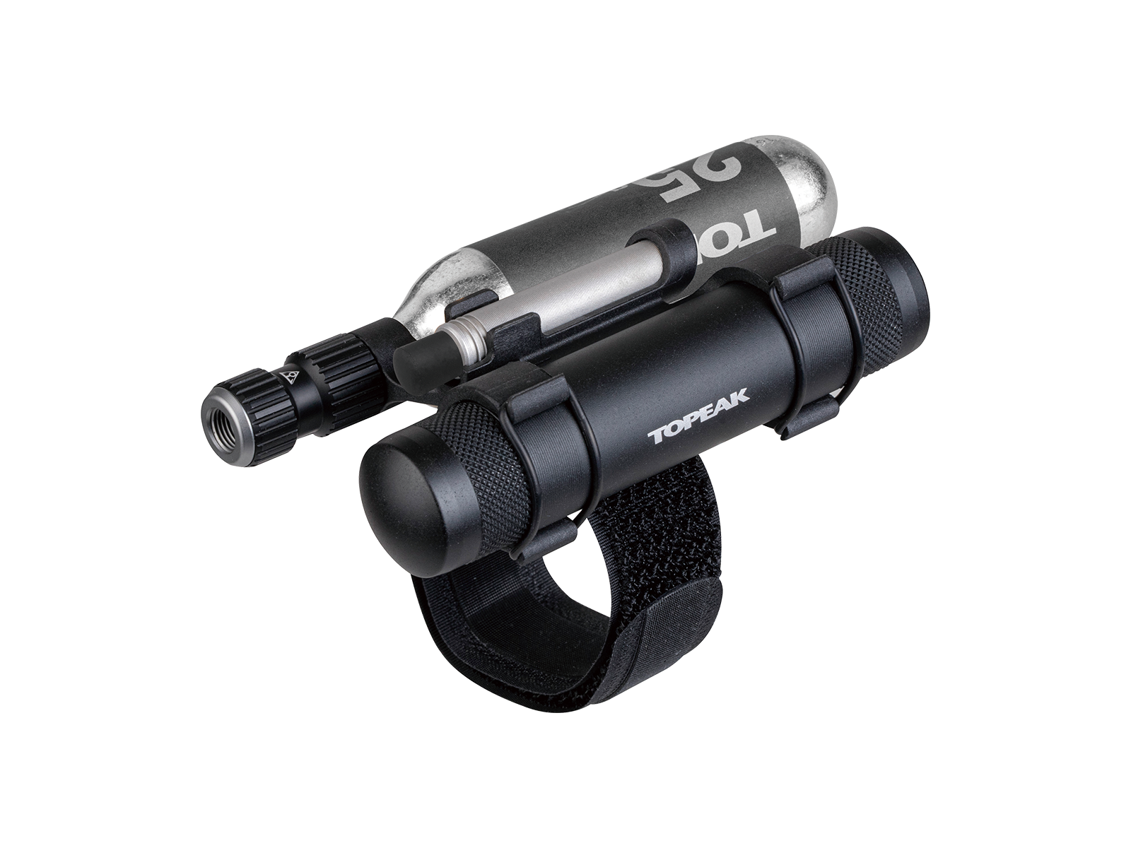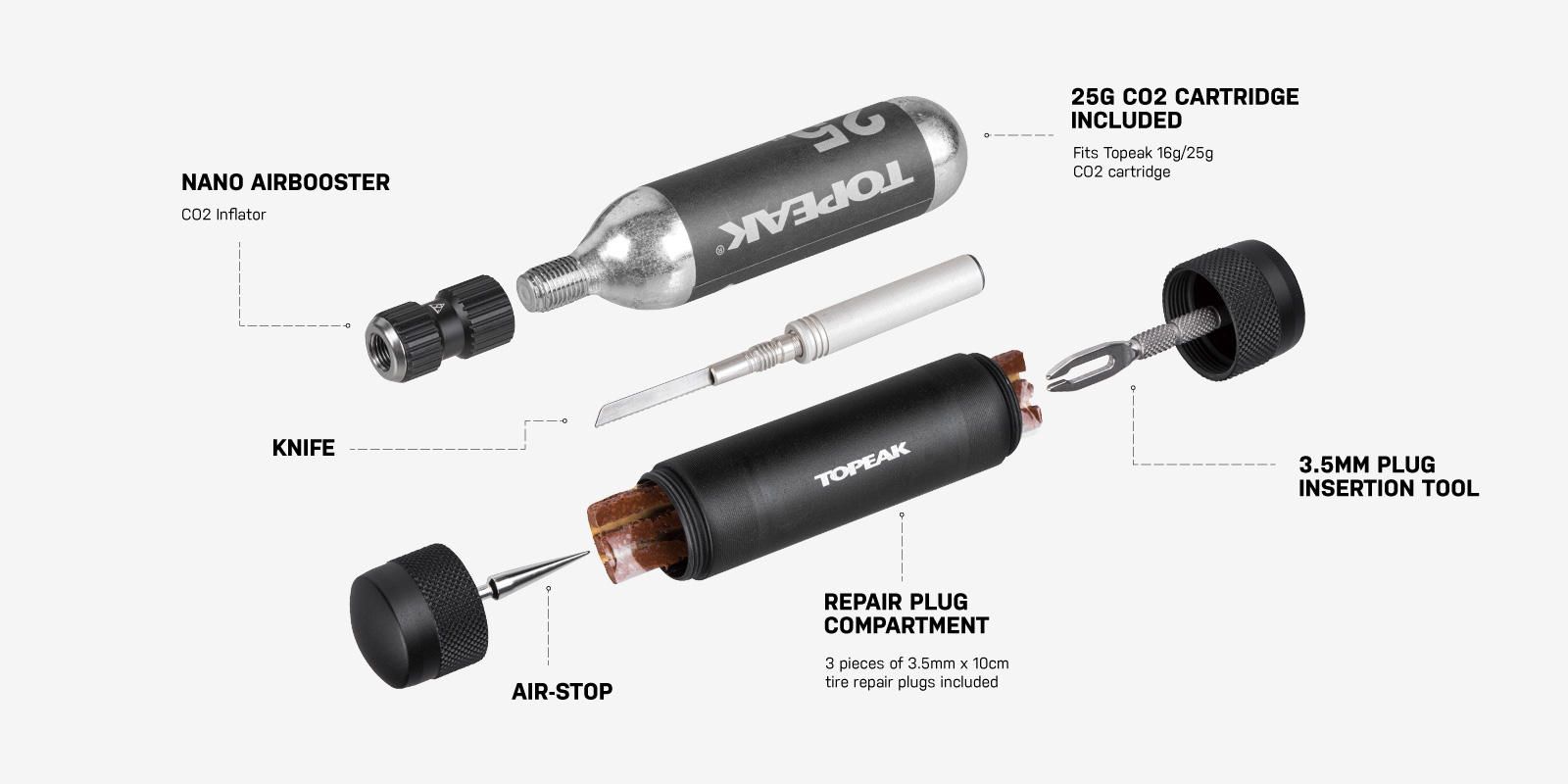 A complete tubeless tire repair / CO2 inflation kit for mountain bikes. Tubeless repair tools are integrated into the pod end caps that feature knurled surfaces delivering extra grip when repairing tires. Included three tire plugs store inside a machined alloy pod, knife with holder and a Nano AirBooster with 25g CO2 cartridge secures to a mounting module that can be strapped to a frame tube or seatpost.